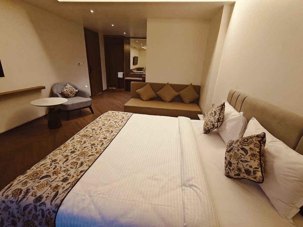 This premium luxurious room is equipped with a double bed, attached washroom for private stay. Room is dedicated for a comfort stay with all luxurious and basic amenities.