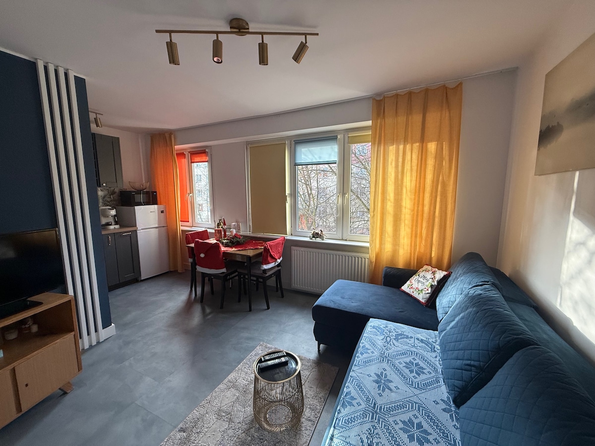 En moderne 2-værelses lejlighed indrettet i skandinavisk stil, beliggende i en rolig bolig lige ved siden af byens centrum. Lejligheden er fuldt udstyret og klar til at leve. Det har et opholdsområde i form af en stue med en sovesofa (soveområde til to personer 140 x 200 cm), et fuldt udstyret køkken (køleskab, ovn, opvaskemaskine), en meget stor balkon, et soveværelse med en seng med et soveområde på 140 x 200 cm og et badeværelse med bruser og vaskemaskine.