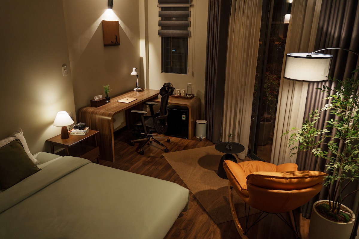Located right at the central of the city , this flat has a special design , a spacious beautiful bathroom with double bathtubs facing on the city view through big glass wall. The retro furniture of this house is organized thoughtfully, creating a smart use of the living space. Visitors will find themselves in a peaceful relaxed environment after a long day to explore the city tourist attractions