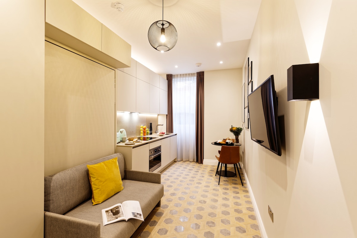 Denne elegante 1-værelses lejlighed på første sal tilbyder den perfekte blanding af luksus og komfort. Det åbne køkken/stue er møbleret med designermøbler, mens det moderne køkken har en elegant finish. Det rummelige soveværelse har en kingsize-dobbeltseng og indbyggede garderobeskabe. Det tilstødende badeværelse har både et brusebad og et separat badekar. Vigtigste funktioner: • Højt loft • Rummeligt køkken/stue • Kingsize-seng og indbyggede garderobeskabe • Moderne en-suite med badekar og bruser