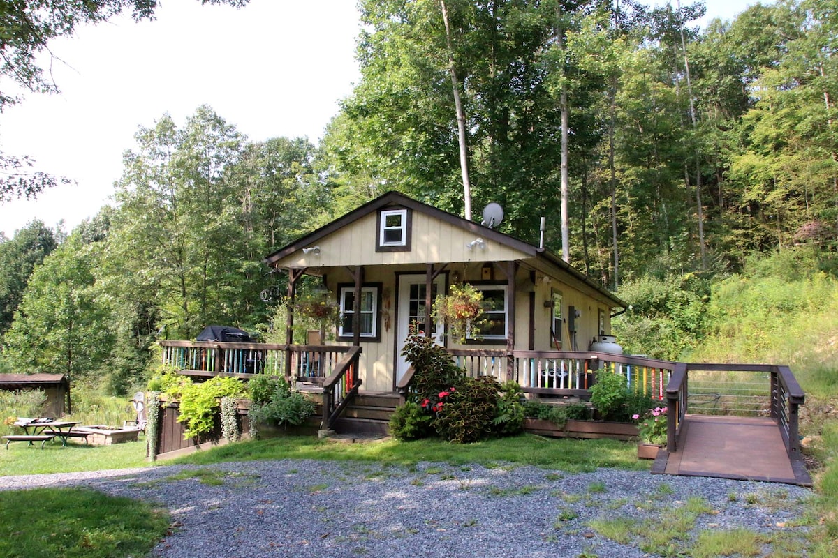 Set about a quarter mile off the road, our pet friendly solar powered vacation cottage is a perfect getaway for anyone trying to spend some alone time with nature! Guests have complete privacy inside the cottage with a full kitchen, two TV's, Wi-Fi, and a mini split system for heating and cooling. As well as exclusive access to the hot tub, fire pit and pond outside! We also have various shared hiking trails through the woods surrounding the cottage for campers and cottage guests to enjoy!