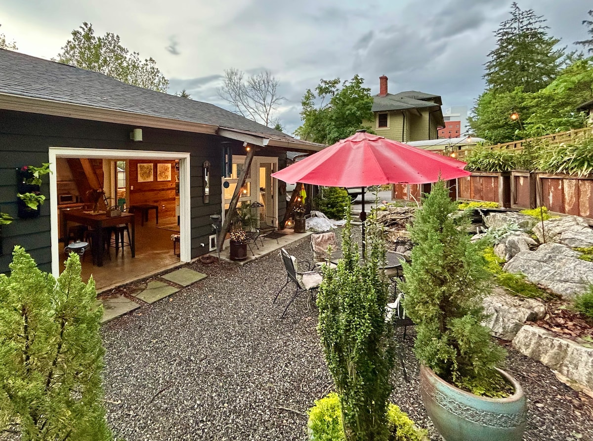 Efter over 1.700 gæster er vi beærede over at være i top 1 % af AirBnBs opslag, næsten alle femstjernede omtaler, et højt niveau af gæstetilfredshed. Denne private lejlighed på 825 kvm med et soveværelse og et bad ligger på nederste etage i vores smukke treetagers bolig i et smukt kvarter. Din egen private indgang og fantastisk terrasse. Gæsterne elsker kingsize-sengen. Du er på en bakke med udsigt over skoven, men kun få minutter fra populære steder. Og vi har en Tesla-oplader på niveau 2 til rådighed.