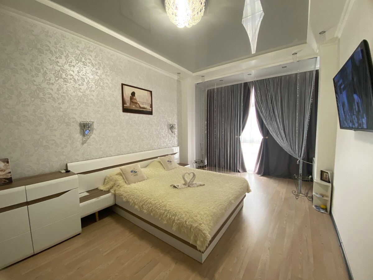 Hyggelig og stilfuld lejlighed i det nye boligkompleks "Prokhorovsky Kvartal". Moderne og komfortabelt kompleks i selve centrum af Odessa. Lukket område, videoovervågning, sikkerhed. Der er flere supermarkeder, Mikhailovsky Park, offentlige transportstop i nærheden.
