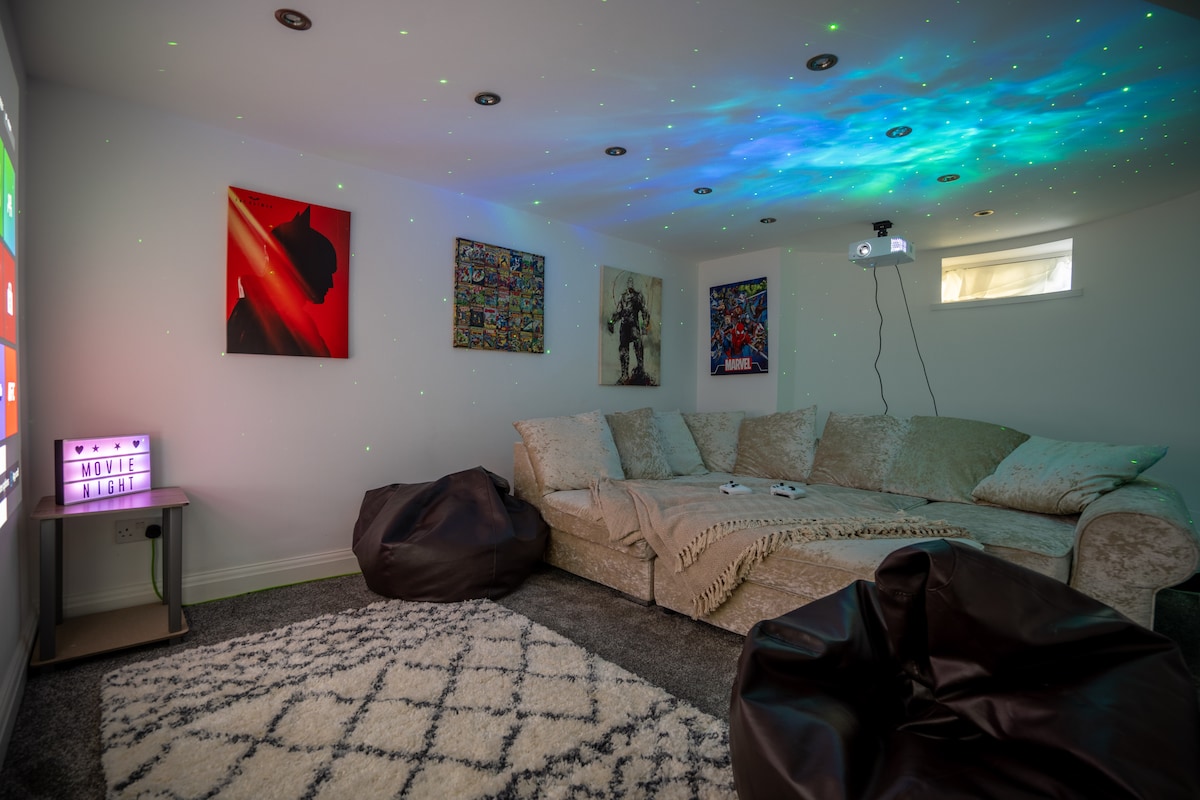 EKSKLUSIV TAGLEJLIGHED MED HAVUDSIGT Skræddersyet taglejlighed, havudsigt, udsigt over parken, balkon, brændeovn, 200" biograf. Blackpools førsteklasses loftslejlighed. Nyd uafbrudt udsigt over havet og parken fra loungen/balkonen. Designerkøkken og badeværelse med gang i spa-dusj. Fuld surroundlyd 200-tommers biografoplevelse. Rigtig brændeovn og trægulve overalt for en unik loftoplevelse. Ubegrænset 5GWifi, nøglefri låse, centralvarme og elbil.