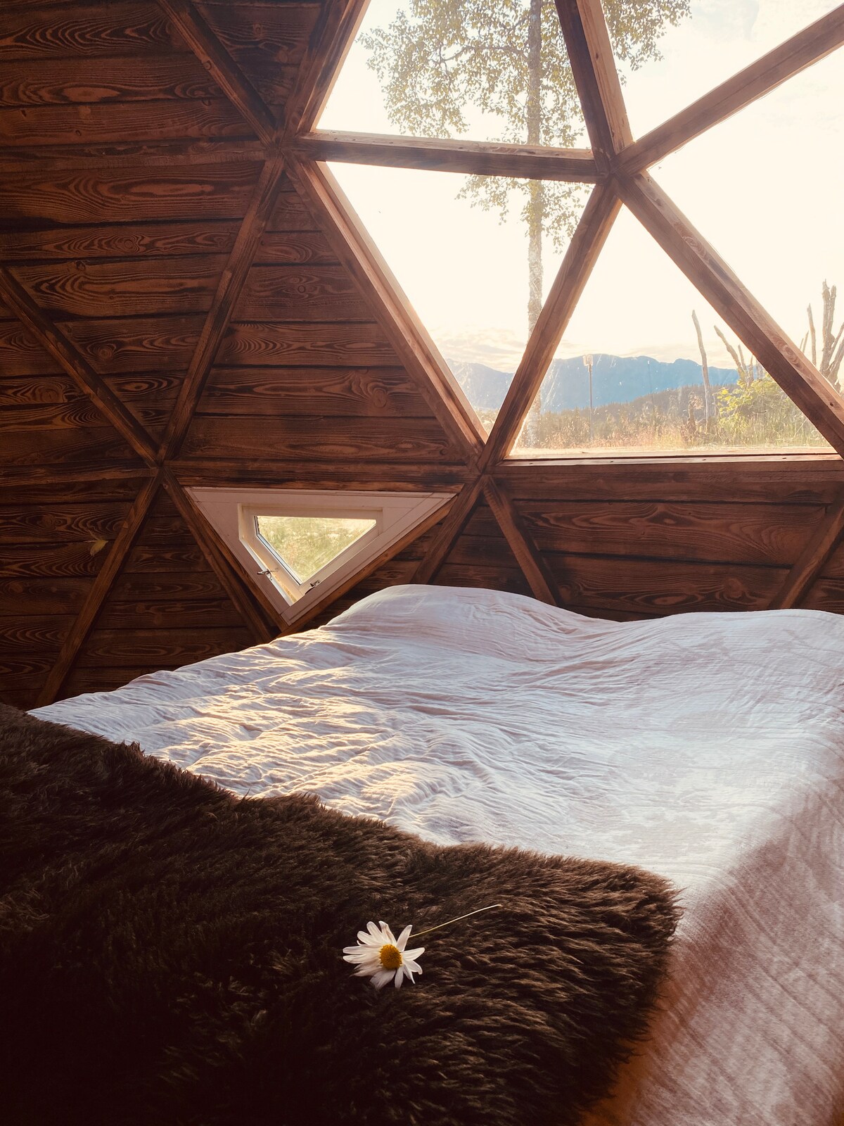 Luksus glamping i naturen, vågn op til fuglene, lyt til hjortene, der strejfer rundt i skoven, sid på sporvognen til småsnak med fårene, vær glad for alle de insekter, der bor på blomsterengene, lyt til åen, bade i vildmarksspaen?. Kom og oplev kuplen med et ovenlysvindue til astroturisme/ nordlys, stjerner, ild i pejsen, magisk akustik og en queensize-dobbeltseng. Forbundet med udendørs køkken, bruser og toilet. Muligt at booke; Flydende brændefyret sauna, SUP-bræt og kano/kajak. Nyd den smukke natur i denne romantiske kuppel.