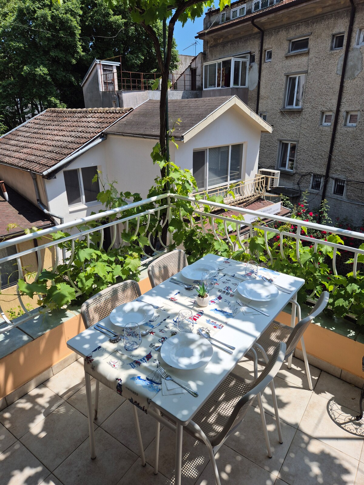 Denne rummelige lejlighed ligger på øverste etage i en kulturarvsbygning i det centrale Batumi og har en sjælden 40 m² stor tagterrasse med panoramaudsigt over byen. Kun 5 minutter fra Seaside Park og 7-10 minutter fra stranden. Gåafstand til Europa-pladsen, det gamle Batumi, caféer, restauranter og vigtige seværdigheder. Et unikt ophold, der kombinerer historisk charme med en førsteklasses beliggenhed. Denne bolig har plads til op til 9 gæster. Ting, der er værd at bemærke: - Ingen elevator – Ingen fester eller høj støj