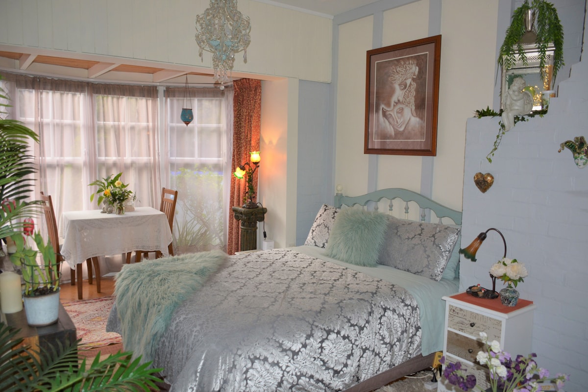 Lille, men komfortabelt, privat selvstændigt, fuldt airconditioneret værelse med ensuite, beliggende blandt storslåede træer og have i top boligområde. Den har sin egen låsbare indgang og ligger kun 15 minutters gang eller 5 minutters kørsel til byens centrum - 10 minutters kørsel til vingårde og Omaka Aviation Centre. Mikrobølgeovn, elektrisk stegepande, brødrister, lille køleskab, bestik, service og glas er inkluderet. Bemærk: ingen kogeplade eller ovn. Enheden har også et smart-tv med Netflix og Freeview.