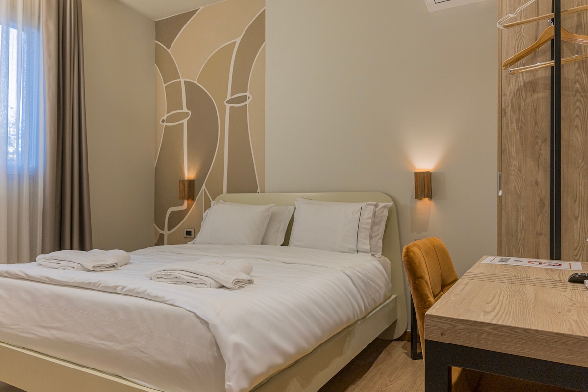 Dette er et dobbeltværelse! Hotellet har en gunstig beliggenhed, kun 3 minutter fra den nye bazar (en af de mest foretrukne destinationer for turister) og 5 minutter fra centrum af Tirana. Hotellet har 6 dobbeltværelse og 2 Deluxe-dobbeltværelse.