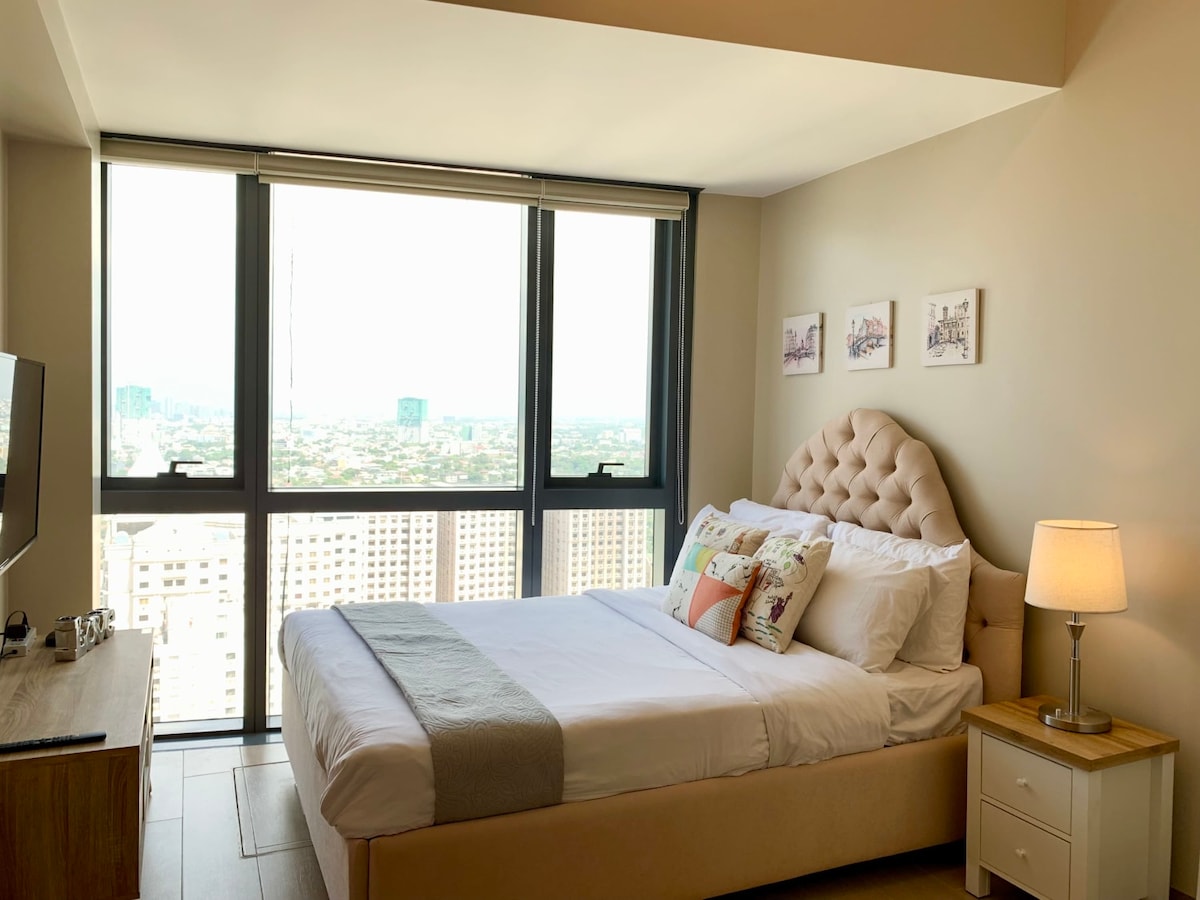 Nyd det simple liv i denne fredelige og centralt beliggende bolig i nærheden af universiteter som Ateneo de Manila University, UP Diliman osv., indkøbscentre og restauranter. Lejligheden tilbyder en afslappende queensize-seng, et semi-udstyret køkken, et opholdsområde med et 50-tommers 4K Ultra HD Smart Samsung TV, højhastigheds Wi-Fi, aircondition, et varmt brusebad og adgang til premium bygningsfaciliteter, herunder en udendørs pool. Nyd også den fantastiske udsigt over byen direkte fra soveværelsets vinduer.