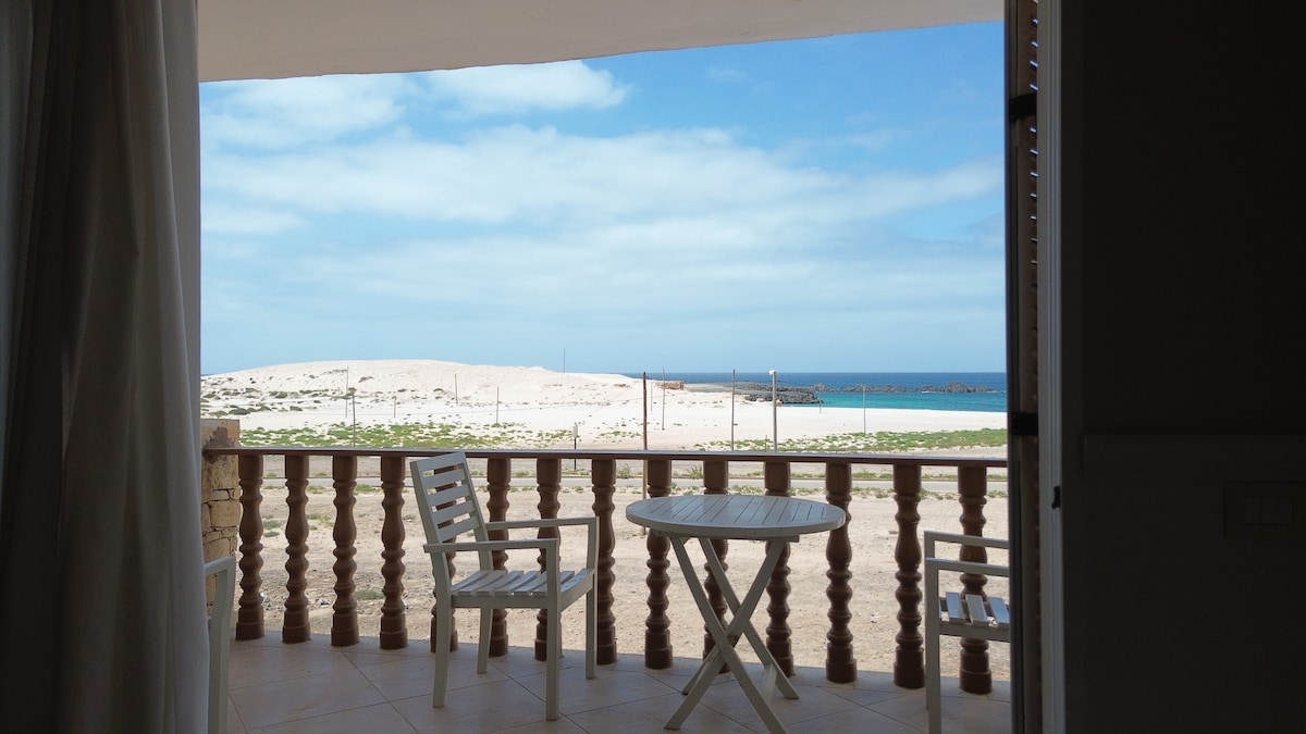 Rummelig T2-lejlighed på første sal med en dobbelt veranda ved havet og fantastisk udsigt over bugten Sal Rei. Lejligheden har et soveværelse med eget badeværelse, privat balkon og egen indgang og et andet soveværelse med dobbeltseng bagved. Stuen-køkkenområdet er generøst fordelt og fuldt udstyret til gæsternes komfort. Den 26 kvm store veranda vender direkte mod bugten Sal Rei og giver gæsterne en forbløffende udsigt over solnedgangen bag øen.