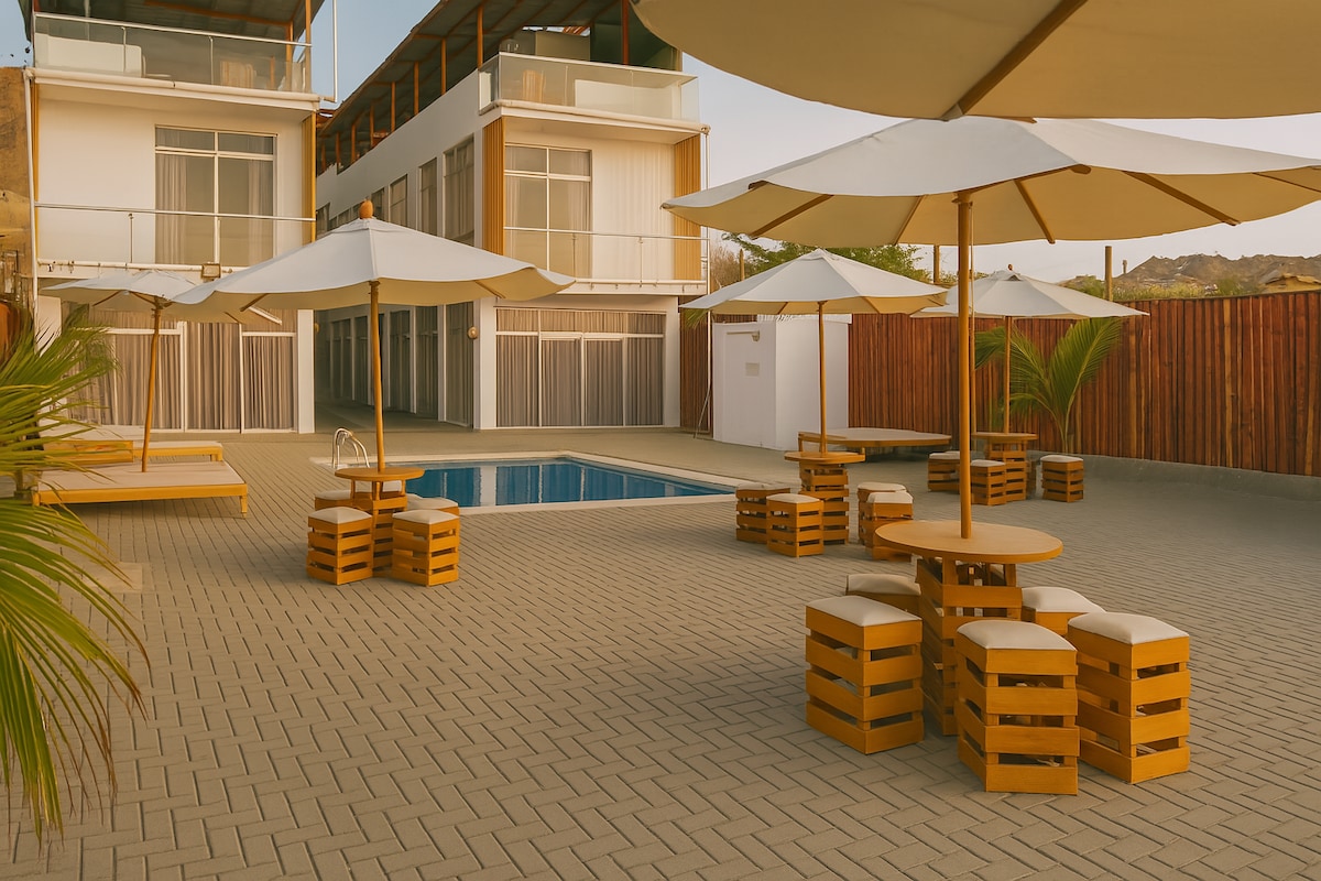 Welcome to paradise in Zorritos, Tumbes! Our beachfront casita is pure magic: a private terrace with an exclusive pool, direct access to the golden sands. Modern and spacious, with a stylish beachy vibe. Equipped with a bathroom and kitchen for your convenience. Part of the exclusive “las Casitas del Norte” Playa Zorritos, where you can enjoy beach access, a private pool, and common areas. Immerse yourself in this unique experience! Book now and live the beach life in a tropical environment.
