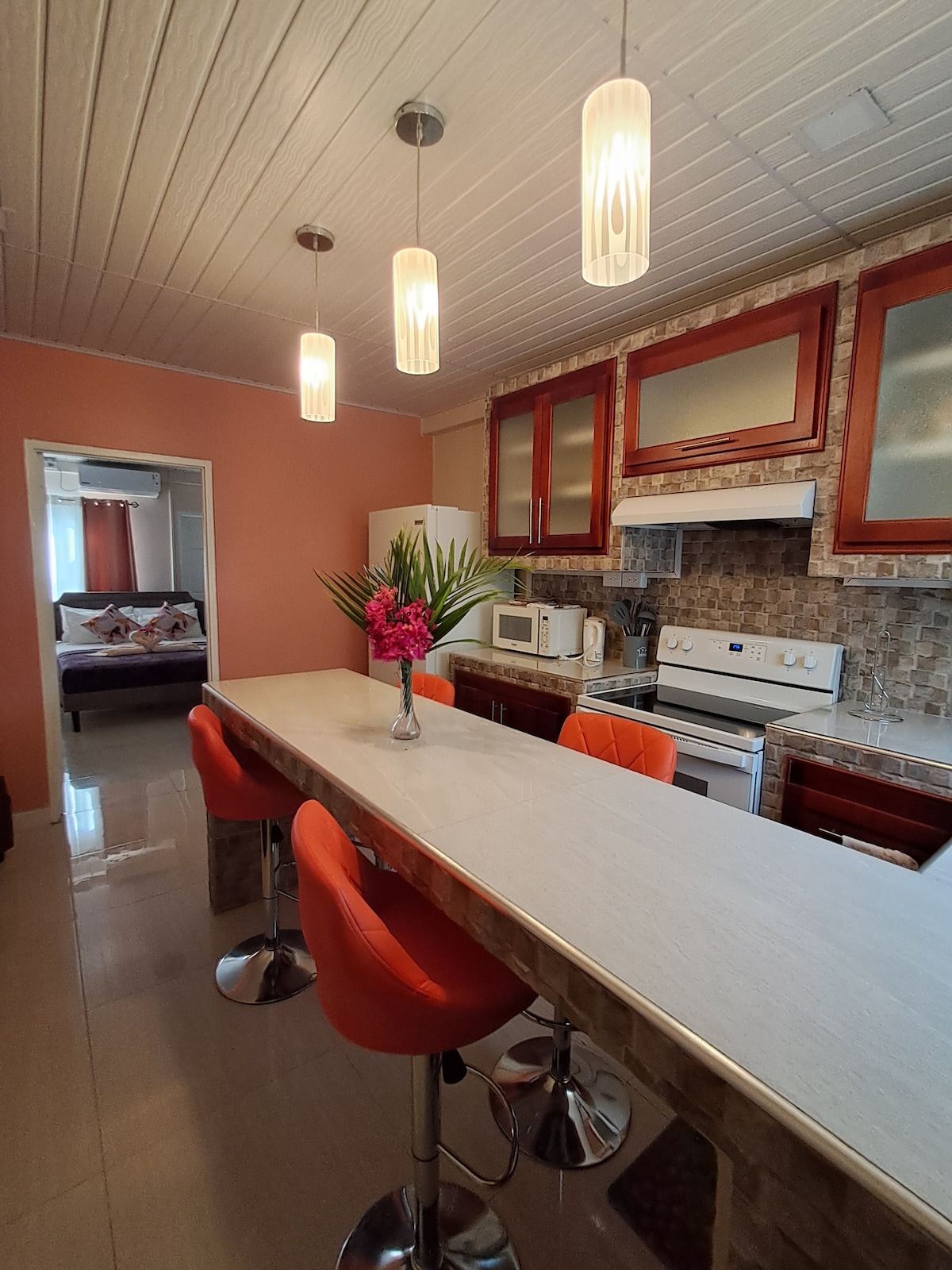 Et hyggeligt, fredeligt hjem væk fra hjemmet og familiedrevet virksomhed i den fredelige landsby Crown Point/Bon-Accord. Det er kun 3 minutter i bil fra lufthavnen, supermarkeder, tankstation, udsøgte restauranter, Pigeon Point Beach, Store Bay Beach og berømte afslapningssteder. Omgivelserne i den nybyggede suite er godt oplyst, og selve suiten omfatter et køkken, stue, soveværelse og badeværelse, terrasse og masser af andre faciliteter, du kan nyde godt af.