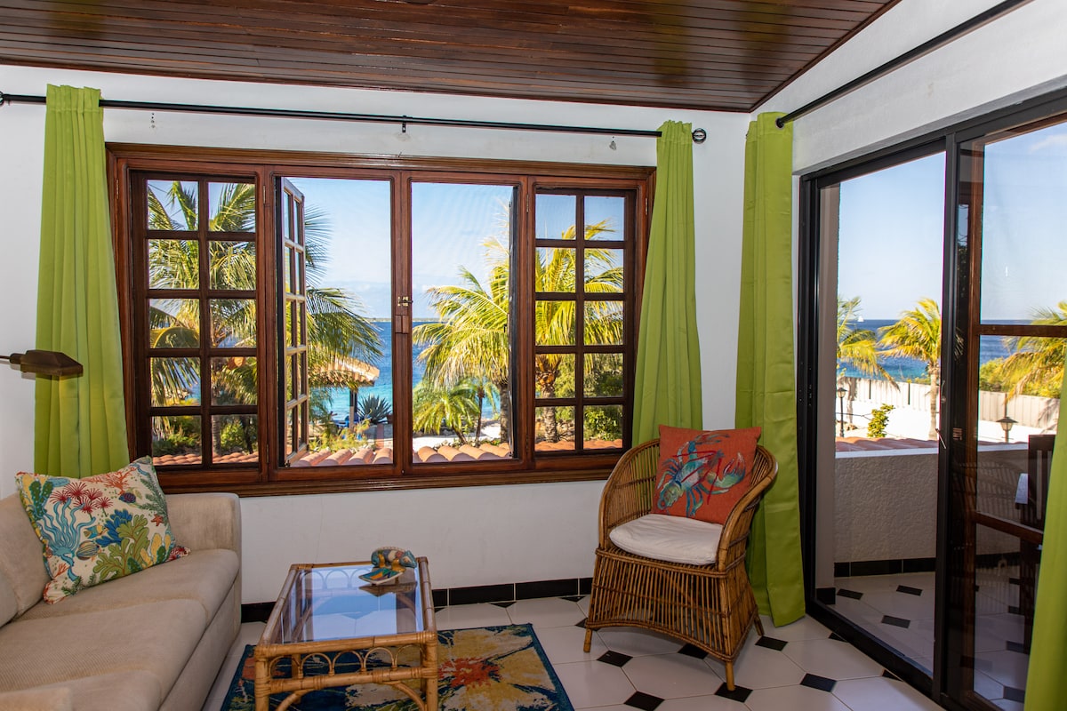 Det Caribiske Hav ligger lige uden for din dør! Spis på din terrasse, og beundr smukke solnedgange fra lysthuset ved havet – begge har en sensationel udsigt over havet og Klein Bonaire. Vores gæster kan dykke ned i ferskvandspoolen kun få skridt væk og bruge private trapper, der fører til Cliff dykkerpladsen. Lejligheden er ideelt beliggende på øen og smagfuldt indrettet med den lokale stil. Et godt sted at dykke, snorkle eller bare slappe af og nyde din ferie i Bonaire.
