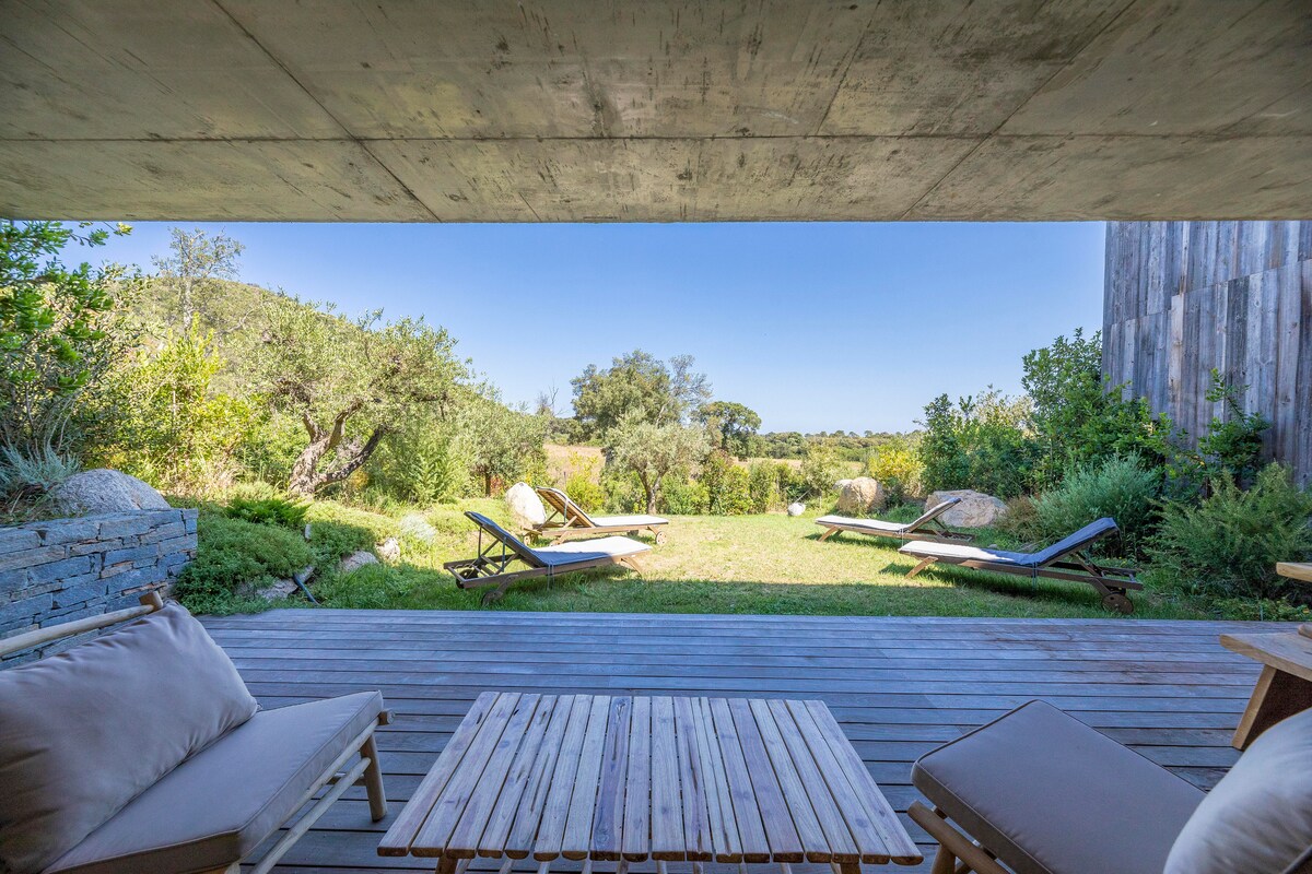 Luksuriøs duplex loftslejlighed, helt ny, beliggende i et stort familiehus af karakter, 10 minutter fra Santa Giulia-stranden, 15 minutter fra Porto Vecchio og 20 minutter fra Bonifacio. Hovedarealet på 45m2 er helt glaseret på sine 2 facader. Det giver en udsigt over maquis, de granitiske bakker og i det fjerne, den storslåede bjergkæde, der er præget af den sydligste top af Korsika: Omu di Cagna. Et sandt paradis for en drømmeferie