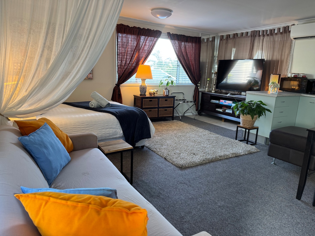Lufthavnen ligger kun få minutter væk i bil! Underholdningscenter - 3 minutter med tog. Byen og mere - tag et tog via en 4 minutters gang fra din lejlighed. Kun få minutter fra Gateway Motorway (M1), hvilket gør det perfekt i enhver forstand! Morgenmad inkl. Vi præsenterer et ophold med aircondition, der er Boho - Boutique - Rigeligt ..Anderledes Din egen private adgang fører dig ind i et nybygget selvstændigt, hundevenligt studie, der er skabt ud fra personlige oplevelser med skræddersyede detaljer.