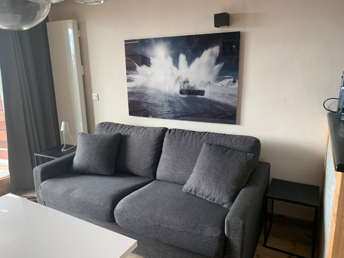 Denne smukke lejlighed, der er fuldstændig renoveret til 2 til 4 personer i en prestigefyldt chalet-ånd, skiene ved foden, beliggende i 5* residensen Le Hameau du Glacier, tilbyder sjældne og unikke tjenester i landsbyen. Du kan gratis benytte alle faciliteter i boligen (fitness, tyrkisk bad, sauna, opvarmet udendørs swimmingpool og jacuzzi), og du har direkte adgang til faciliteterne i Prince des Cimes-boligen, herunder landsbyens eneste opvarmede indendørs swimmingpool.