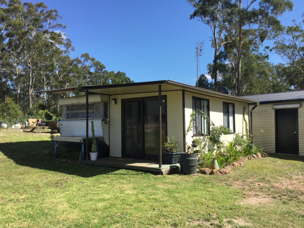 Indkvarteringen består af en stor campingvogn og et anneks med 2 queensize-senge, fuldt fungerende køkken, stue, tv og badeværelse. Beliggende kun 2 km fra Princes Hwy, mellem Bega mod nord og Merimbula mod syd. Ejeren bor på stedet for at gøre det nemmere for dig. Vaskeri til rådighed. Kæledyr under opsyn er velkomne Kennel til rådighed