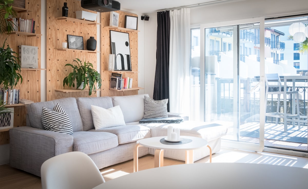 Loft au pieds du Lac Léman. 2 vélos mis à disposition pour profiter des alentours. Parking privé gratuit 🅿️ Frais nettoyage offerts Appartement de 66m2 avec aménagement intérieur moderne et cosy. - Grand lit king size 180 x 200 - Salle de bain avec baignoire. - Lave linge et sèche linge. - Cuisine ouverte sur le séjour. - Salon avec canapé transformable. - TV 65’ - Wifi Grand balcon avec vue dégagée sur le port de la Marina et des montagnes. - Place de parc privé dans un parking extérieur.