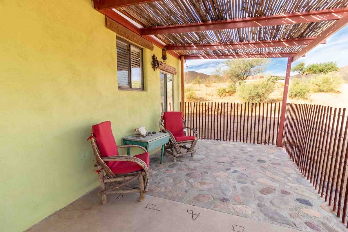 Historiske Adobe i Gold Canyon. Etværelseslejlighed med en queensize-dobbeltseng, privat terrasse, grill og spektakulær udsigt over Superstition-bjergene og de omkringliggende golfbaner, seks golfbaner inden for 11 km, fem åbne for offentligheden. Tæt på alle Superstition vandrestier. Medbring dit kamera, hvor du vil se masser af dyreliv, hjorte, prærieulve, Harris-høg, vagtler. Det er ikke noget problem at parkere. Fredfyldthed og komfort og utrolige solnedgange venter på dig,på ti hektar uberørt Sonoran-ørken, masser af privatliv.