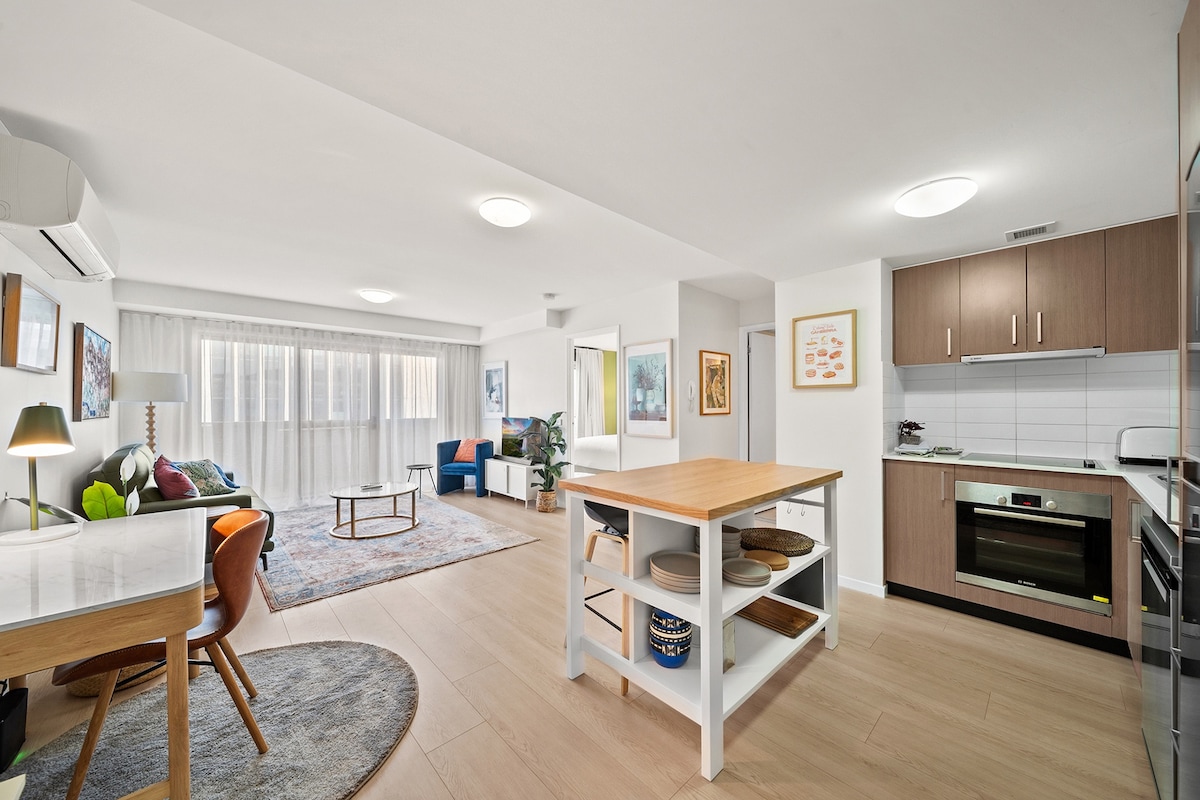 *Book today to unveil the beauty of this lovely apartment :) Key highlight: - Complimentary Secured Parking - Rooftop BBQ area with 180° Mountain View (Building Amenities) - 2 mins walk to Canberra Center - 5 mins walk to Lonsdale St (Place for good restaurant and pubs) - 6 mins drive/17 mins walk to the ANU - 8 mins drive to Canberra airport - 9 mins drive to Mount Ainslie Lookout Our stylish apartment has blackout curtain and quality mattress to comfort your stay.