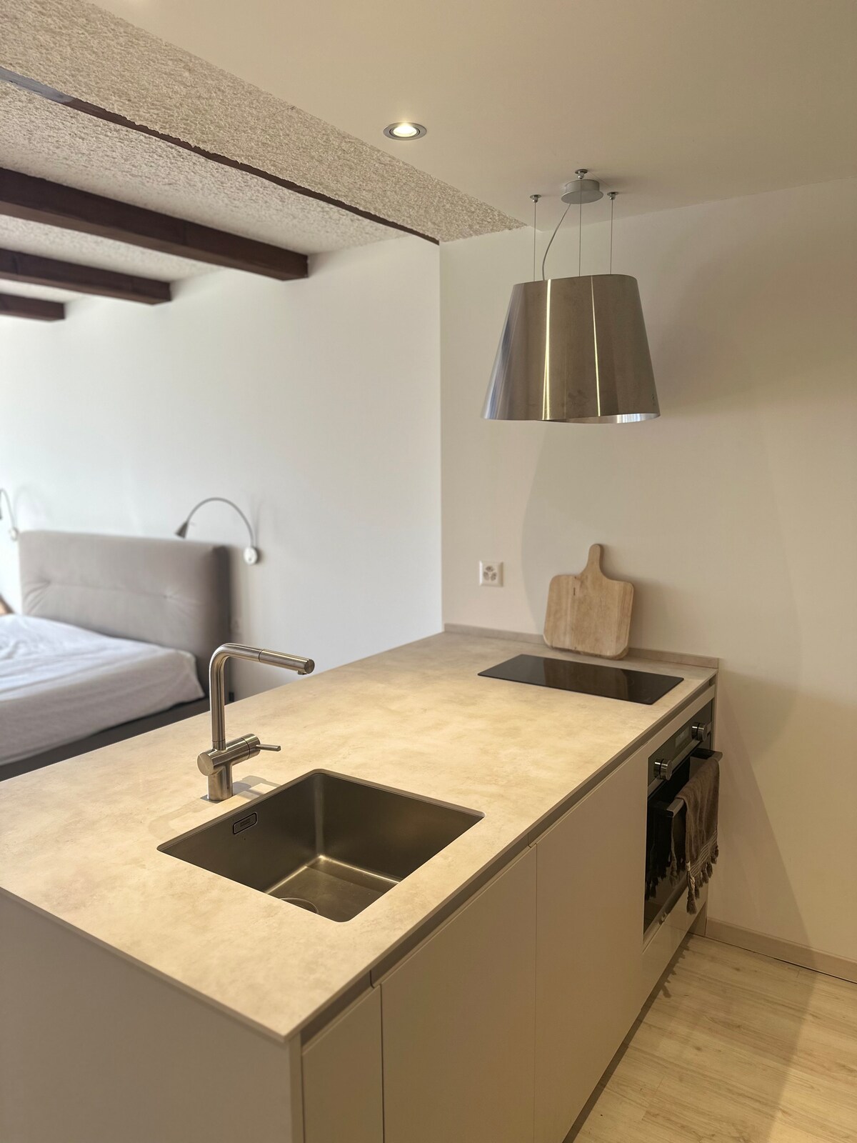 Lejligheden er en del af et anneks, der blev bygget i 1950 til min fars hytte. Denne hytte blev bygget i 1850 af min oldefar, mine bedsteforældre boede der, og min far og hans søster blev født der. Lejligheden er blevet renoveret for nylig, og er møbleret enkelt og funktionelt. Foran hytten er der en græsplæne, som i lang tid har været køkkenhaven og den eneste indtægtskilde for min bedstemor, der blev enke for tidligt.