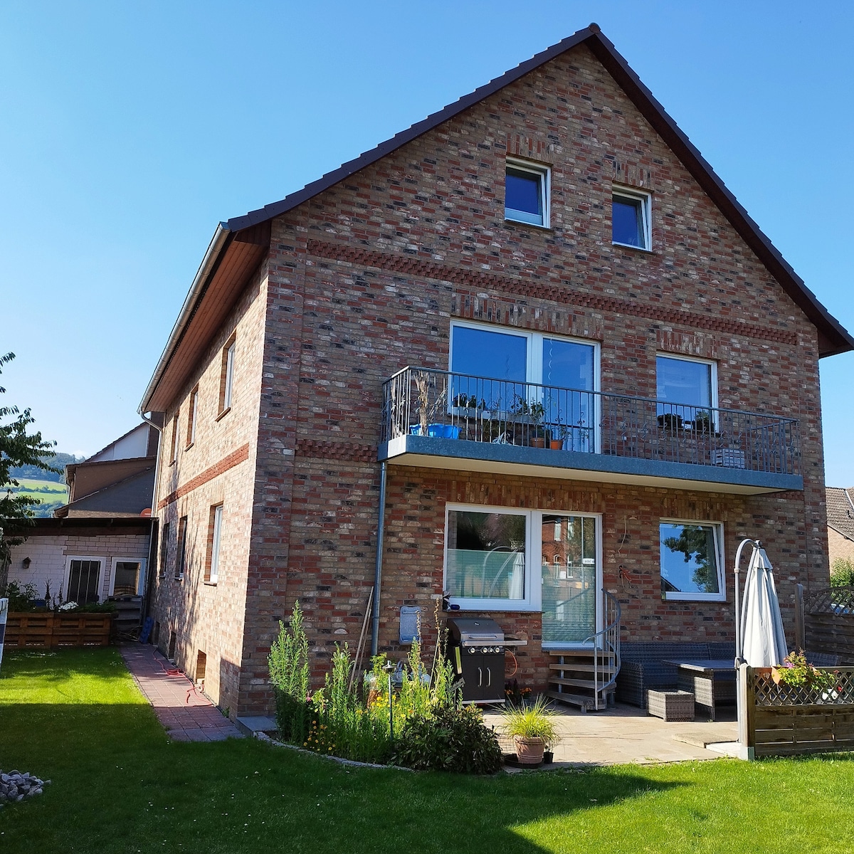 Unser Hof liegt direkt am Waldrand,nahe dem Kurort Bad Pyrmont mit Blick in eine unverbaute Naturlandschaft. Die Wohnung für Monteure und Feriengäste mit 3Etagen und 4 Schlafzimmern wurde neu eingerichtet.Separater Eingang im EG mit Flur,Garderobe und Waschraum mit Waschtrockner. In der 1. Etage befinden sich die 4 Schlafzimmer und ein großzügiges Bad mit Dusche und Wanne. In der 2. Etage die große Küche mit anschließendem Wohnbereich und überdachtem Balkon.WLAN und Parkplätze vorhanden.