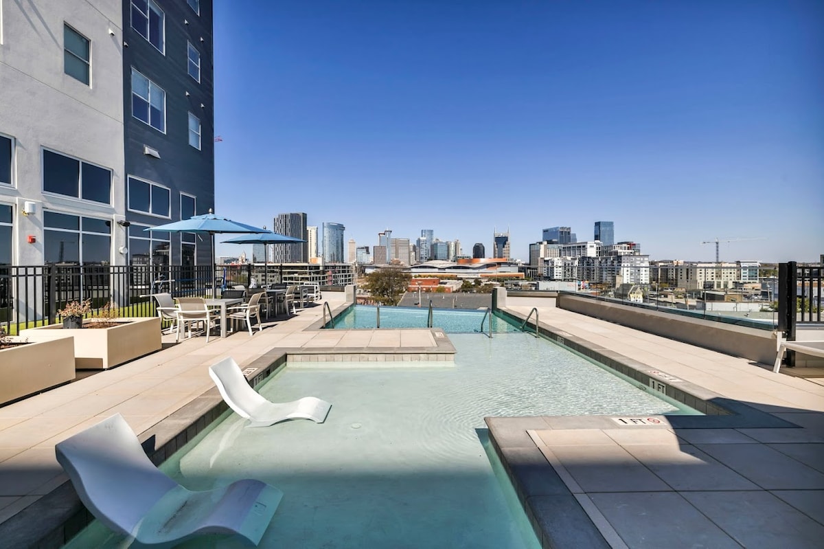 Velkommen til Music City! Kom og bo i vores bløde centralt beliggende store lejlighed i centrum af Nashville og 6 minutters gang til Broadway og andre lokale attraktioner. Nyd udsigten over byen fra balkonen eller himlen, tilbring varme sommerdage ved poolen eller tag ud på Broadway! Enheden har en reserveret parkeringsplads i bygningen til en billig pris! -Music City Center - 0,1 km -Bridgestone Arena - 0,4 km - Roadway - 0,6 km - Nissan Stadium - 1 mile
