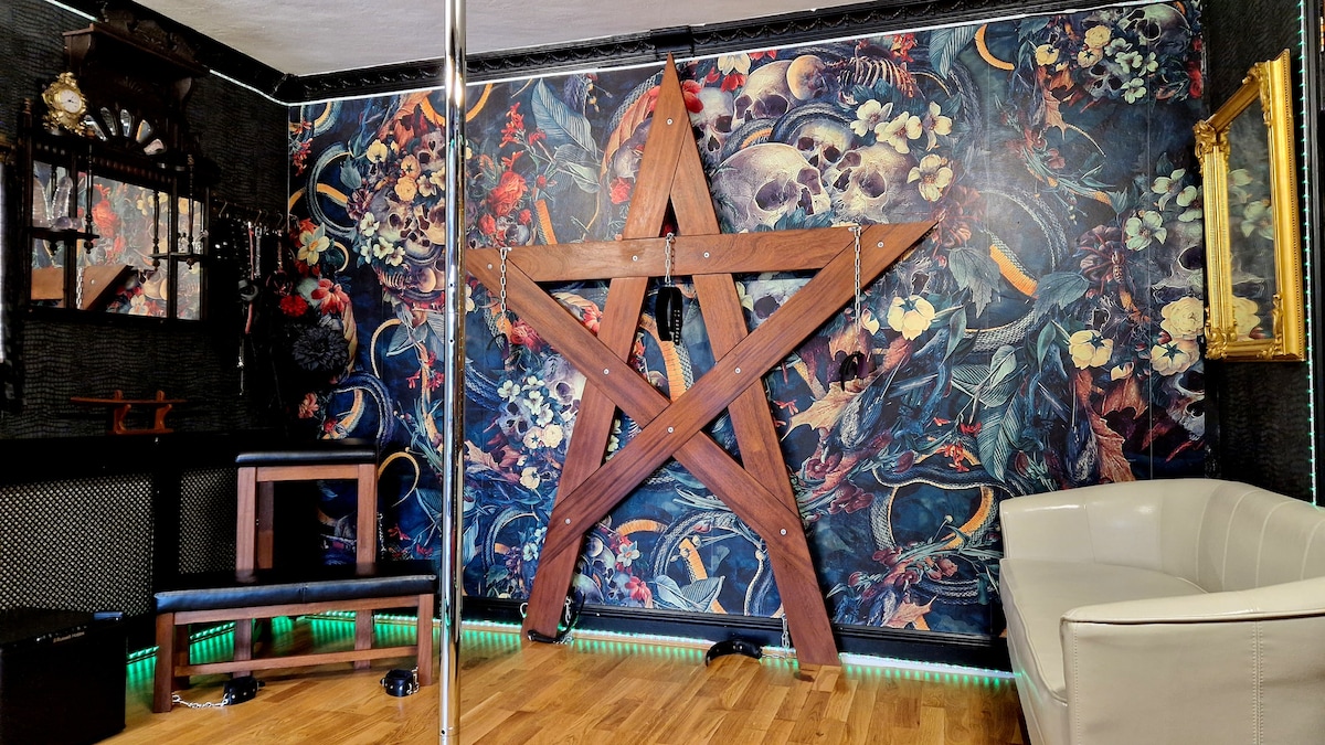 Et kinky og finurligt overnatningssted. Fotografering, swingers og kink-venlig! Privat SELVTJEKNING! Boligen er en del af mit hus. Den har egen indgang gennem haven. Før du ankommer, får du tilsendt en video om, hvordan du får adgang til boligen. Udstyr rengøres og desinficeres efter hver gæst. INTET KØKKEN - minikøleskab og kedel er til rådighed i rummet