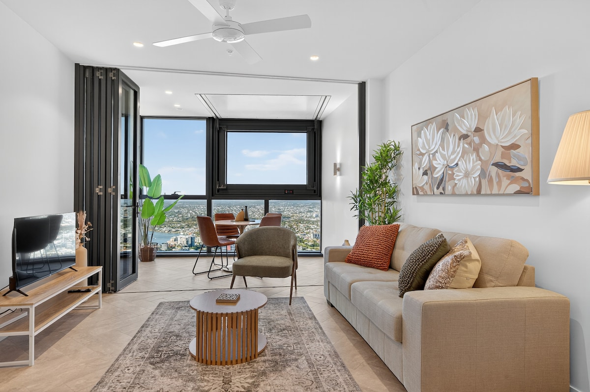 Svigter over byen, og slap af i fredfyldt, skyhøj luksus på New Queen's Wharf. Denne smukke, helt nye kuraterede lejlighed ligger på 59. etage og kombinerer beroligende naturinspireret interiør med en fantastisk, uhindret udsigt over Brisbanes skyline, flod og bjerge. Træd ind i et roligt rum, hvor bløde jordfarver, naturlige teksturer og luksuriøse finish skaber det perfekte fristed – uanset om du er her på forretningsrejse, en romantisk udflugt eller en fredfyldt ferie i hjertet af byen.