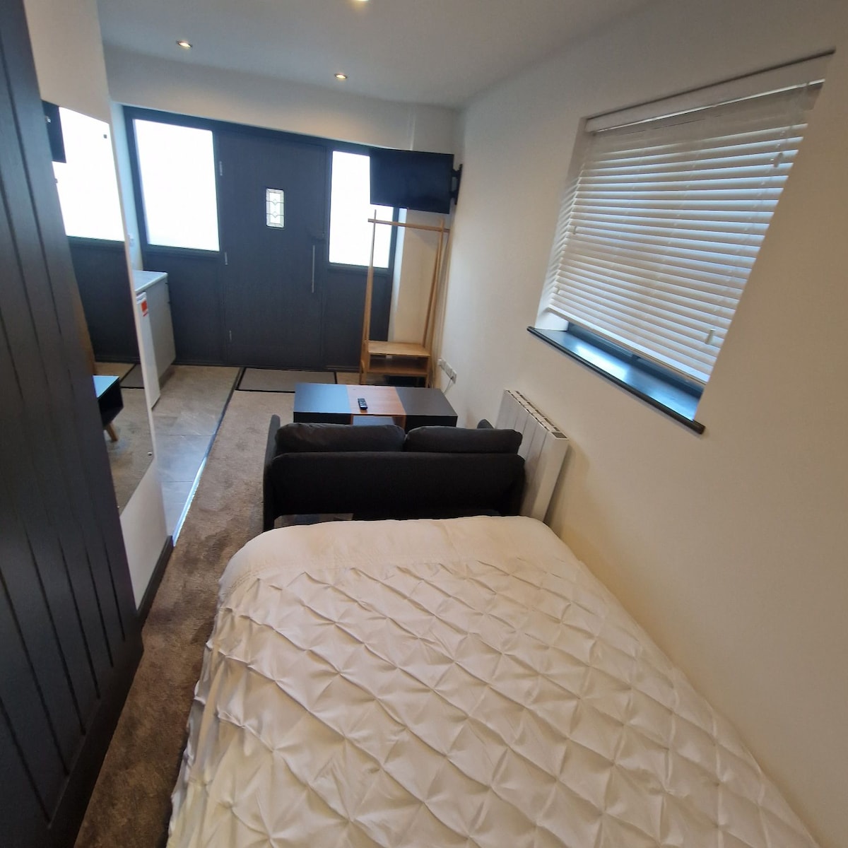 Vi har lavet vores garage om til en fredfyldt lille lejlighed. Det er et enkelt rum, der tilbyder basale faciliteter og WiFi. Studiet har en hems med dobbeltseng og synlige bjælker. Der er en kaffemaskine, kedel og lille køleskab Bemærk, at der ikke er noget køkken i ejendommen, så der er ingen mulighed for madlavning. Studiet ligger bag husene på vores gade via en privat vej. Selvom der ikke er en privat have, støder den op til offentlige skove og ligger en kort gåtur fra floden Frome.