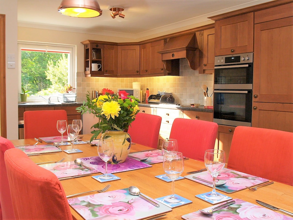 Et rummeligt fritliggende 2-etagers hus, der ligger i et roligt kvarter, med et stort møbleret delvist overdækket terrasseområde, hvor du kan nyde drinks, grill og en skrånende have med gynge. Stue med 55" 4K TV/internet wi-fi/køkken-tv med Chromecast. I gåafstand fra færgen og tæt på alle lokale faciliteter, butikker, barer, spa, golf, sportsplads, udgangspunkt til Goat Fell. Auchrannie Leisure & Spa har et væld af afslappende og fitnessfaciliteter, herunder en legeplads til børnene, og ligger kun 5 minutters gang væk.
