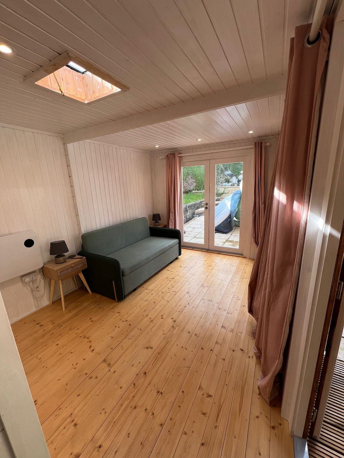 Denne lille hytte er moderne, ren og lys med et åbent køkken til højre, når du træder ind ad døren og sidder bagved med franske døre, der fører ud i haven. Soveværelset er lille, men komfortabelt med masser af plads til tøj i en indrettet garderobe med hængende hylder. Badeværelset har badekar med brusebad, toilet, vask og friske hvide håndklæder. Omgivet af natur, træer, buske og med lyden af fugle, der vågner op til, er det et virkelig afslappende sted.