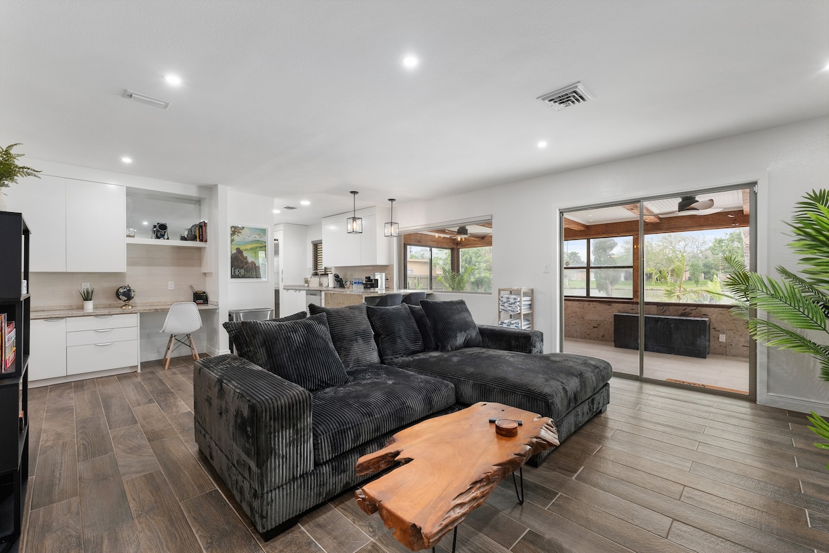 En fuldt renoveret moderne bondegård med en XL-pool (med rutsjebane) på en betagende resaca. Nyd to stuer, tre smukke soveværelser og et kontor. Masser af spiseplads med morgenmadskrog, formel spisestue og bar. Beliggende kun få blokke fra Sunrise indkøbscenter, indkøbscentre og en kort køretur til South Padre Island/ spaceX. Dette luksuriøse, elegant indrettede hjem er udstyret til familier af alle typer og omfatter spil og hjemmebiografmuligheder for underholdning. *PS4