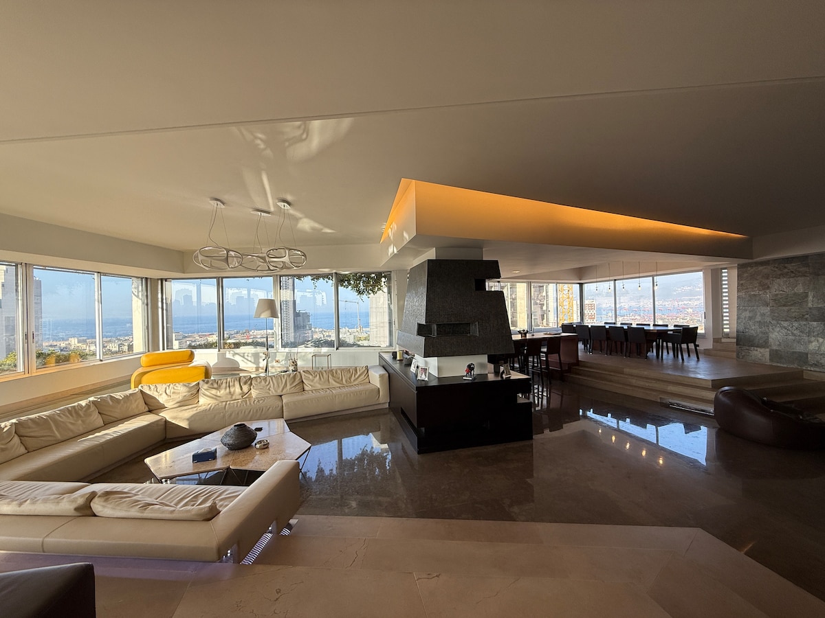 En unik 5-stjernet luksuslejlighed med 3 soveværelser; 24/7 elektricitet , centralvarme og aircondition , WiFi og concierge-service Slap af med hele familien på dette moderne, fredelige sted i centrum af Brummana med enestående udsigt over Middelhavet, dalen, Beirut og bjergene. 5 minutters gang fra restauranter og natteliv.