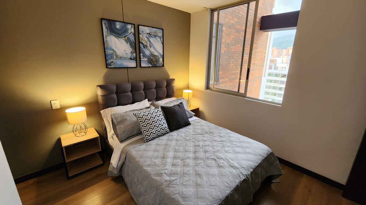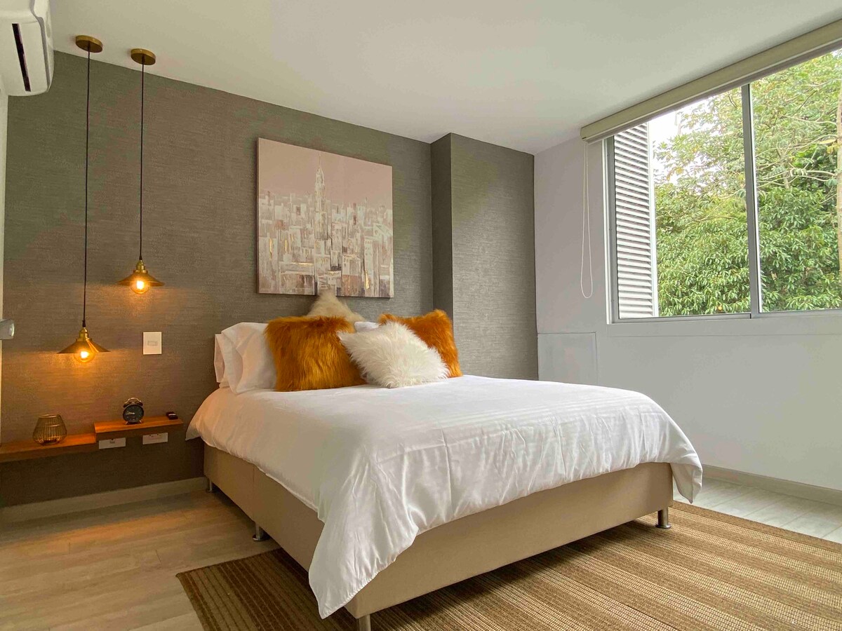 Smuk, helt ny lejlighed. 10. etage med fantastisk udsigt over solnedgangen. Central beliggenhed. Beboelsesområde og sikkert område ved siden af Cacique Mall og Neomundo Convention Center, nem adgang til Carrera 33, Cabecera, Girón og Floridablanca. 2 soveværelser, 2 balkoner, hængekøje, 2 badeværelser, 2 senge, en ekstra seng og en sovesofa. Fremragende belysning og ventilation, 300mbps WIFI, 2 TV'er med adgang til DirecTvGO, Netflix, Amazon og HBO. Stueetagen i komplekset med minimarked, bageri, apotek, blandt andre.