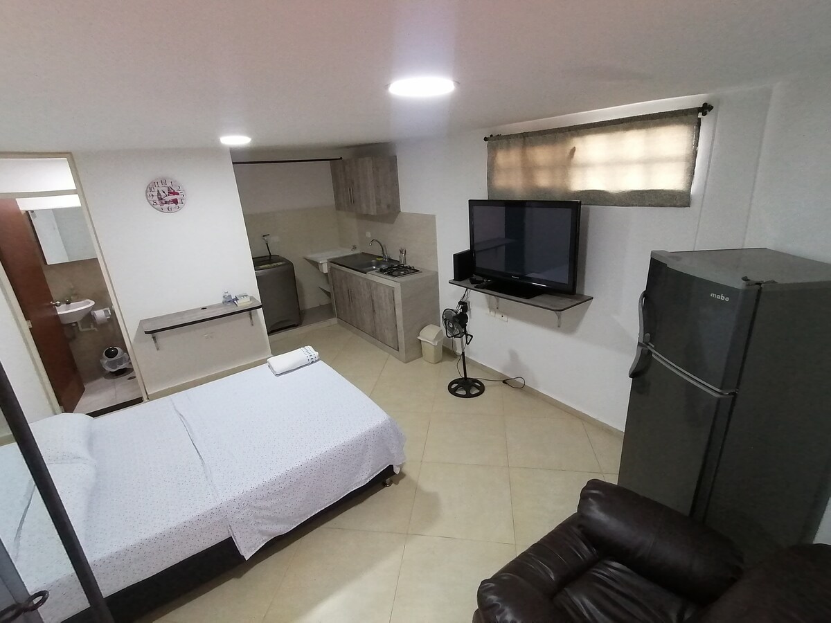 Nyd et ophold i Bucaramanga tæt på skoindustriområdet, Alfonso Lopez stadion, UIS. 5 minutter fra Comuneros-klinikken og HUS, og 10 minutter fra byens forretningscenter, indkøbscentre, supermarkeder. Lejligheden er af typen loftslejlighed og består af et enkelt rum, et soveværelse med dobbeltseng og arbejdsområde, spisestue med foldbar sovesofa, opholdsstue med 43" smart-tv, arbejdsområde med kraftig Wi-Fi, integreret køkken, tøjområde og 1 badeværelse
