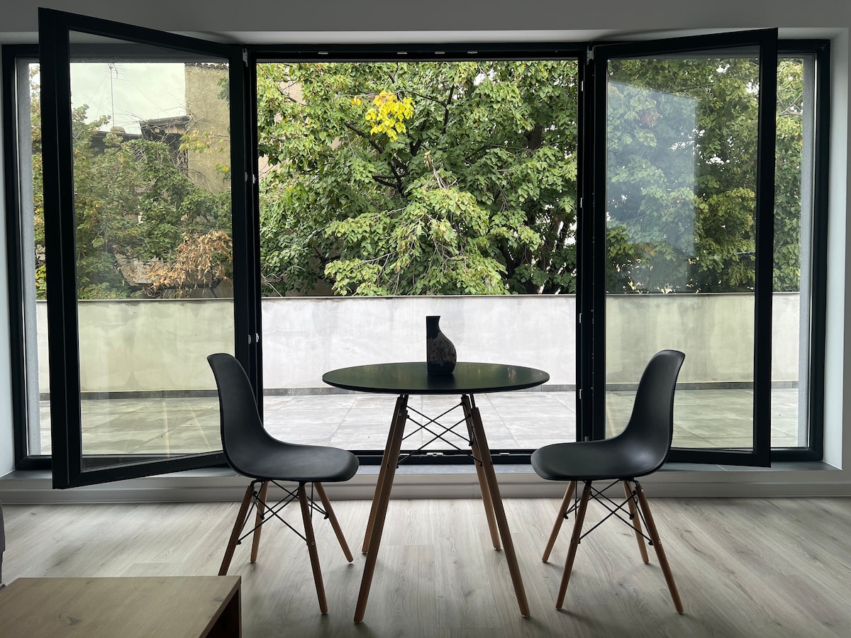 Oplev charmen ved vores urbane loftslejlighed i hjertet af byen! Nyd freden i vores elegante soveværelse med brede vinduer, der fylder rummet med sollys, og nyd et luksuriøst marmorbadeværelse. Denne indbydende bolig ligger i et dejligt kvarter og har et fuldt udstyret køkken, en afslappende stue og en lille balkon. Perfekt til den moderne rejsende, der værdsætter stil og komfort. Book dit ophold – nyd den enkle luksus, og gør dette loft til dit personlige skjulested.