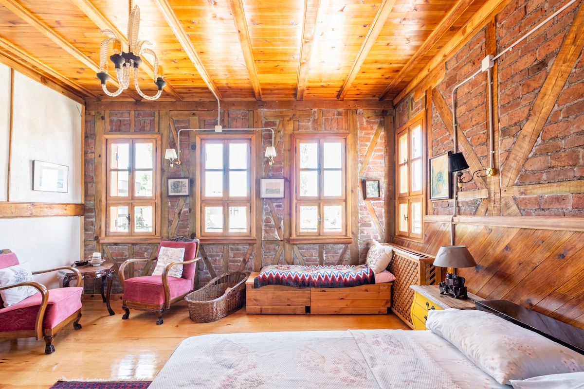 6 hytter beliggende i skoven 15 minutter til Bursa centrum og 20 minutter til Uludağ skisportssted. 2-etages 80 m2 hytter på i alt 13.000 m2 jord. Et fantastisk sted at komme væk og slappe af med egen have, vandrestier og private udsigtsterrasser. Vores huse opvarmes med varmesystemet, og du vil ikke gå på kompromis med din komfort på hårde vinterdage. Hvis du ønsker det, kan du tilberede mad i dit eget køkken, eller du kan vælge at spise på vores restaurant