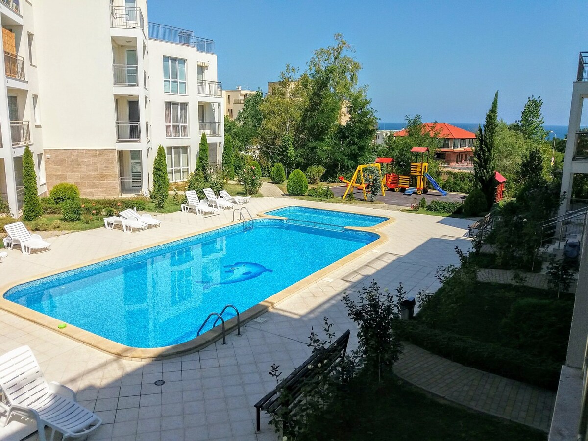 8 trin til stranden er helt ny og hyggelig lejlighed med betagende og hjertestjugende havudsigt. Alt er tæt på! Du vil være første linje til stranden med fantastisk helbredelse og blødt sand, så du kan høre bølgernes sange Sanatorium-2 minutters gang, Salt Museum-5 minutters gang, Burgas by-10 km , lufthavn-7 km. Den gamle bydel og centrum - ti minutters gang. Turtoget stopper lige foran dig. Der er mange restauranter,butikker, attraktioner, sommerbiograf og en ny vandpark, hvor du kan nyde din ferie!
