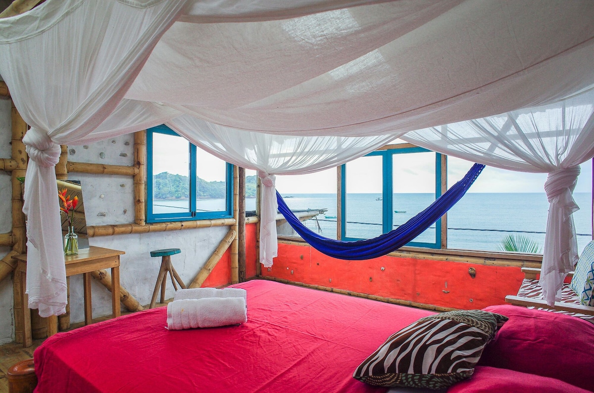 Private Room in Bamboo House . 1 Bedroom - with double bed, Shared Bathroom, Cozy furnished living room with a hammock, Equipped Kitchen. Panoramic views over Mompiche bay and village. Free Wifi