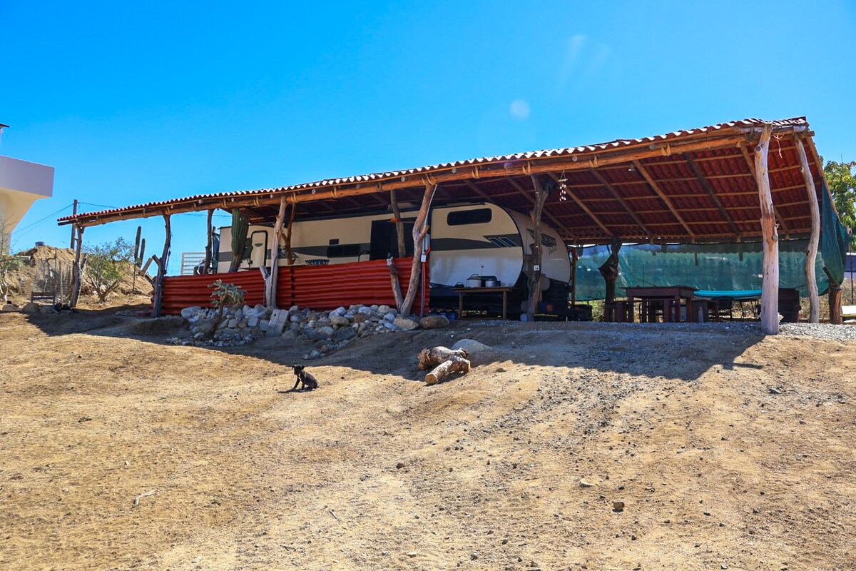 RV Klus offers a unique escape into a Baja Lifestyle. It offers a camper with 2 bedroom, 1 bath and all its amenities. Enjoy the shaded patio, cool breeze and incredible beach view. The property is completely fenced and there is plenty of parking space. We are also pet friendly and just a short 5-10 minute walk to Los Barriles beautiful beaches where you can snorkel, fish from shore or just take a quick bath in the ocean. Relaxation guaranteed!