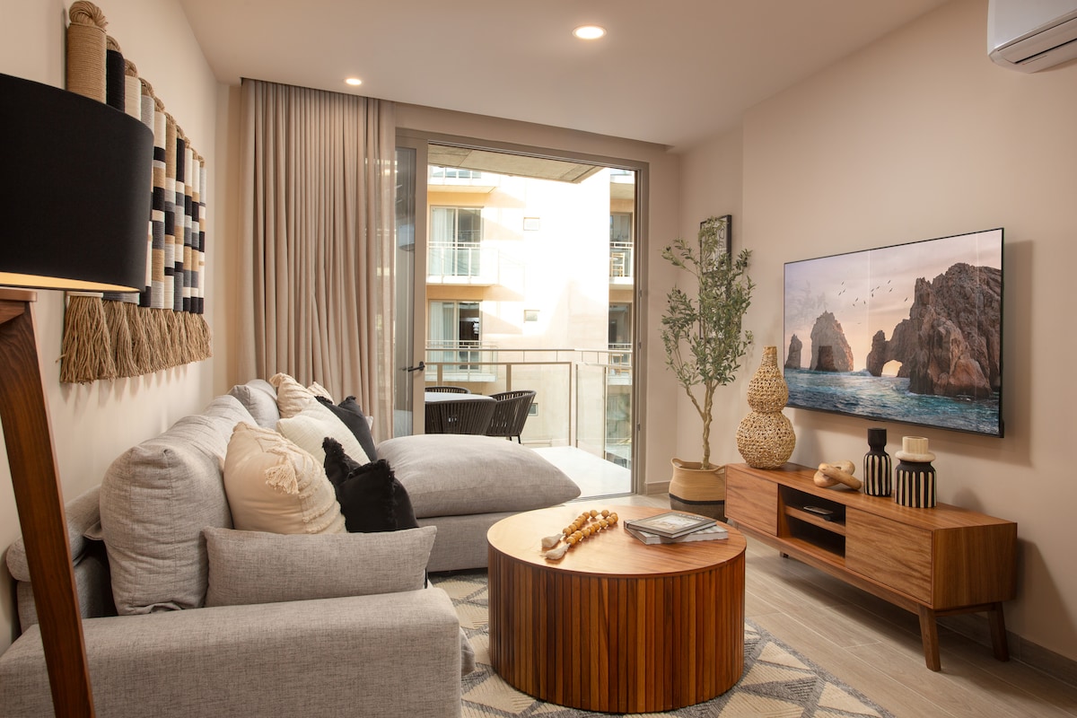 Welcome to your spectacular ocean-view condo! - Brand new, modern space with luxury marble finishes. - Two bedrooms with en-suite bathrooms and air conditioning throughout. - Large terrace for dining with stunning ocean views. - Access to an infinity pool, gym, and tennis court in the secure complex. - Conveniently located just minutes from El Médano Beach and downtown Cabo San Lucas. - Complimentary WiFi and parking included.