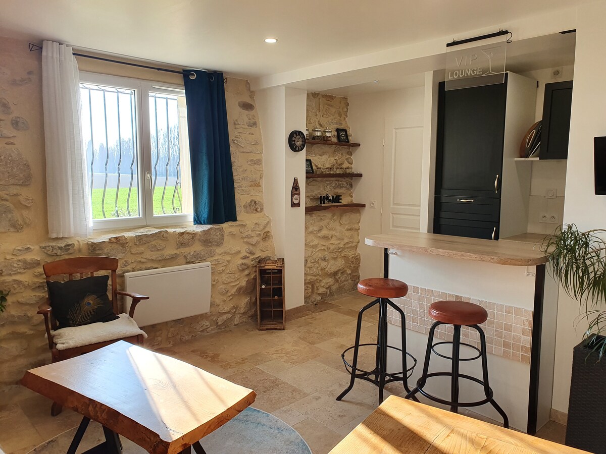 Notre logement de 45 m2, très propre, climatisé et au calme, est entièrement neuf au rez-de-chaussée d'une ancienne bâtisse, où l'on est complètement indépendant et en intimité. L'intérieur est cocooning avec pierres apparentes et bois : entrée, pièce principale, petite chambre avec lit queen size, donnant sur sdb et cour intérieure, petit jardin avec vue sur les champs. Parking gratuit devant. Animaux acceptés. 20 min d'Avignon, 10 min de Marcoule. Arrivée et départ autonomes
