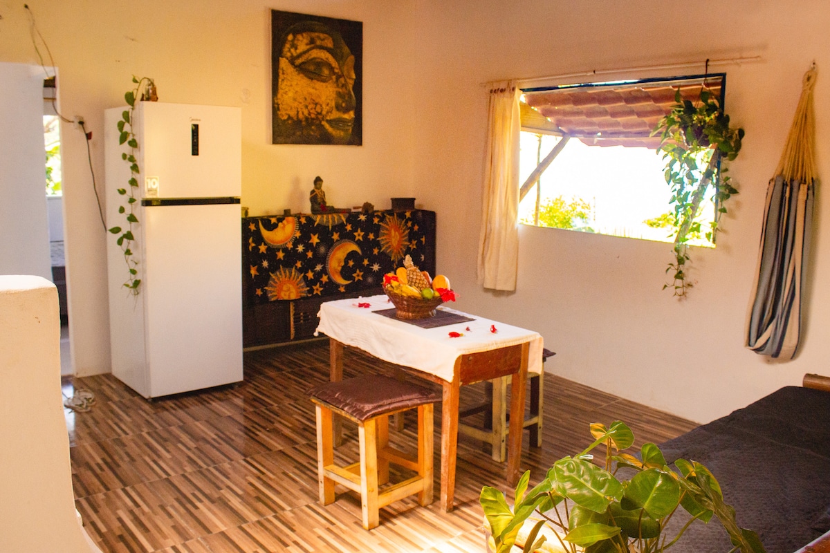 Suite med køkken på balkonen med egen indgang i et smukt hus beliggende i Mata do Serrão. Altan, bruser med varmt vand, dobbeltseng, minibar, myggenet, ventilator. wi-fi Stille, godt ventileret sted med en behagelig udsigt. Du er 5 minutter fra landsbyens centrum og traktoren til Moreré. 15 minutter fra Barra-stranden og 20 minutter til Cueira-stranden