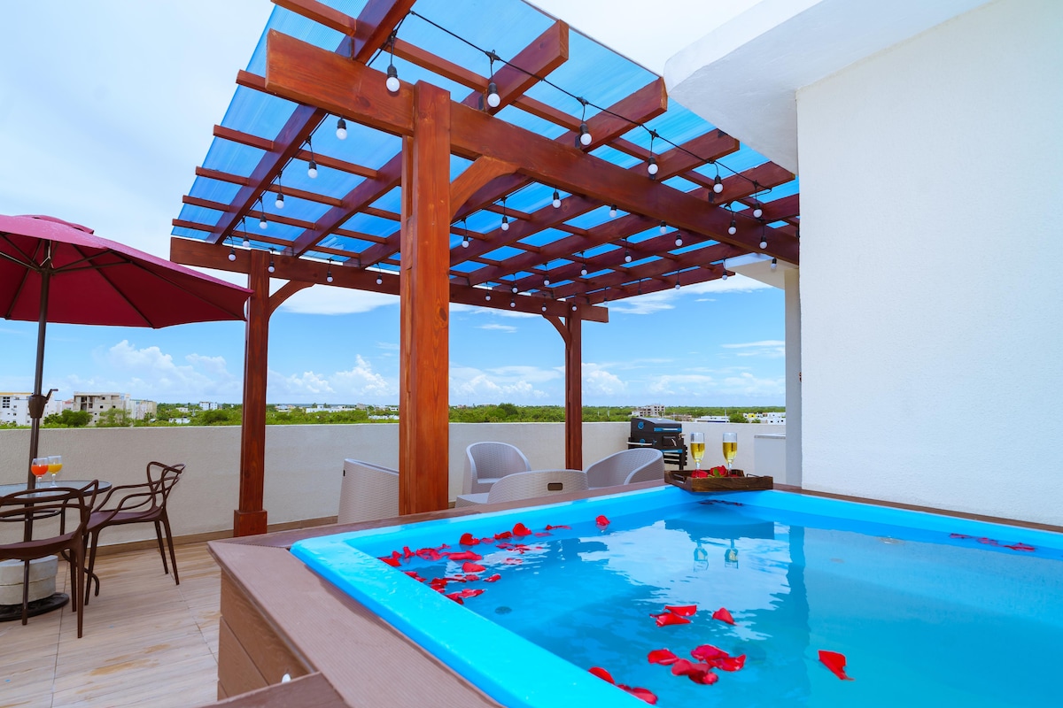 Udsigt til himlen. Tagterrasse med jacuzzi. Strand 5 min.