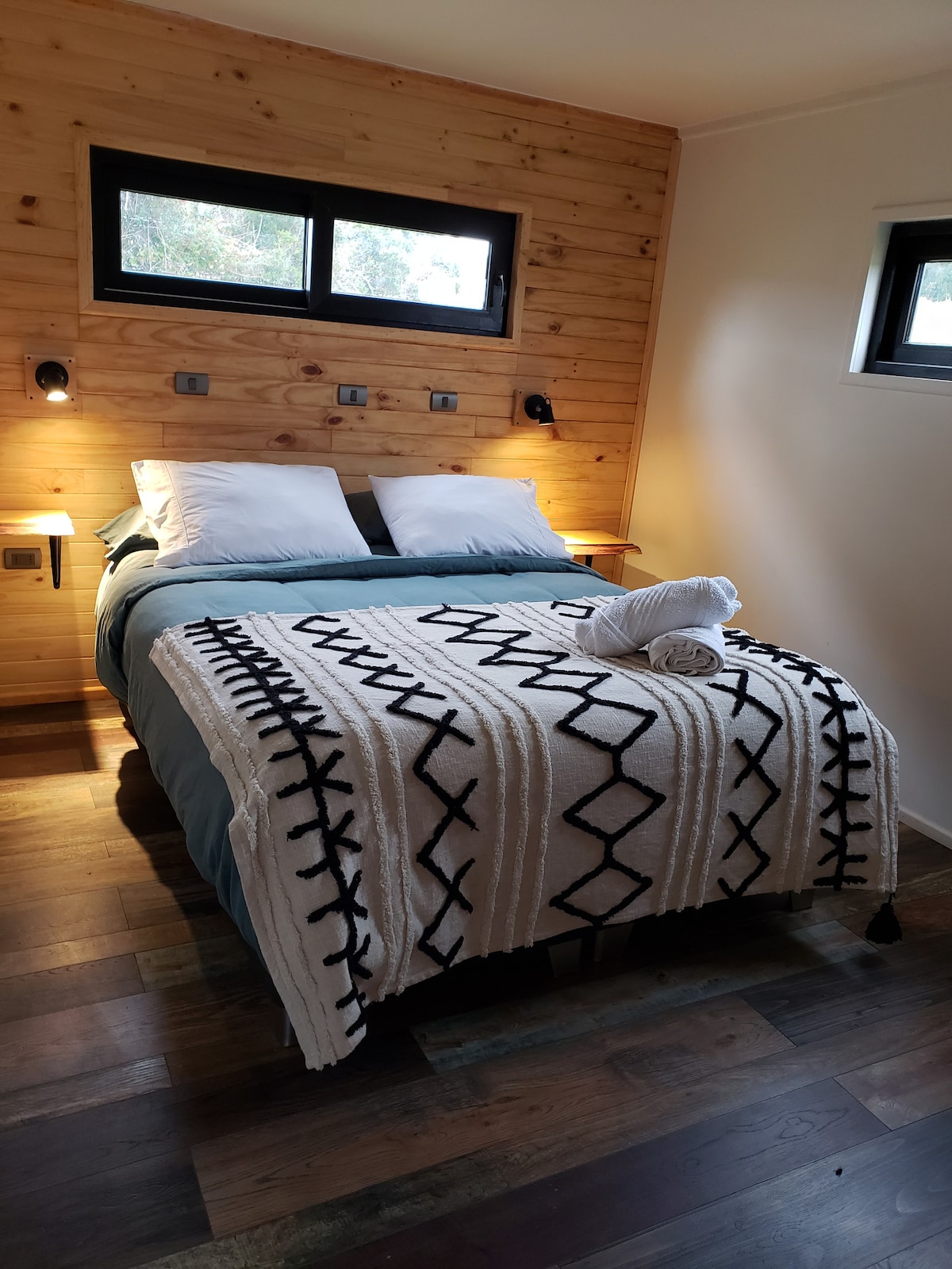 Det er en rustik hytte af typen Tiny house (lille hytte), der er bæredygtig for 2 personer. MEGET VIGTIGT: Der er ikke noget tv, men der er en lille minibar, hårtørrer, køkken med brændeovn og aircondition med varme og køling. Det har et varmt badekar, der koster ekstra 40.000 pesos. Den er omgivet af træer, der er hjemmehørende i området, og er bygget i et forsøg på at opretholde balancen med omgivelserne. Der er en udendørs grill. 1,5 km væk ligger byen Río Puelo og 3 km væk ligger Termas del Sol