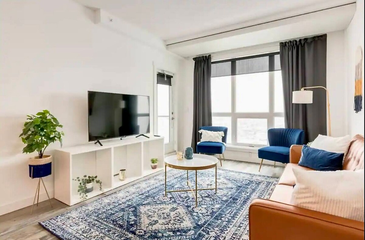 Stilfuld og komfortabel lejlighed med et soveværelse og smuk udsigt over byens skyline, herunder et uhindret syn af Calgary-tårnet. Beliggende i hjertet af Beltline. Gåafstand til alt såsom restauranter, barer, butikker, dagligvarebutikker og alle populære/trendy avenuer. 5 minutters kørsel til floden, Stampede og Saddledome. Vær opmærksom på hoveddørene til bygningslåsen kl. 22.00. Hvis du booker, skal du hente nøglen/fjernbetjeningen et andet sted.
