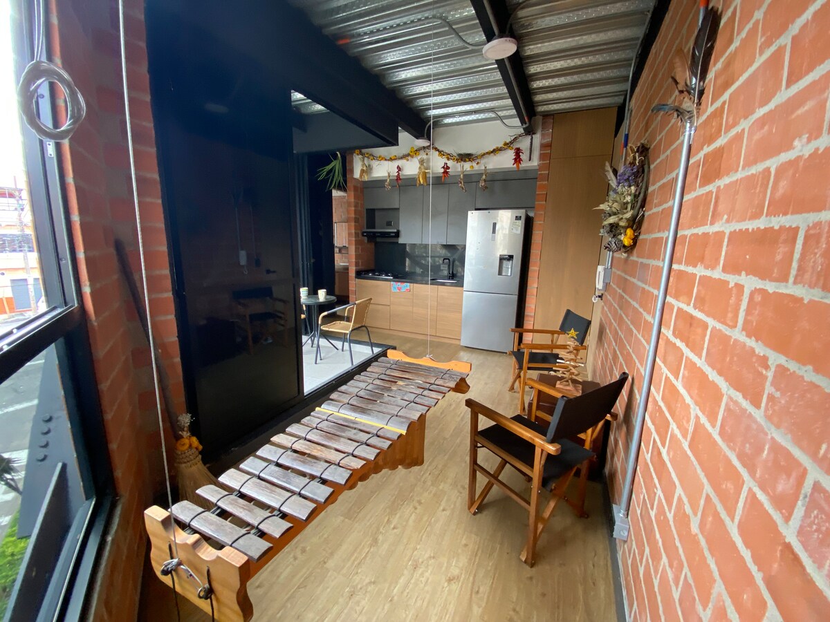 Apartamento Loft en piso 7 con increíble balcón y vista al jardín. Consta de una habitación con cama king de alta calidad , baño y vestier privado, totalmente equipado con aire acondicionado, wifi de 300mb, caja fuerte, smart TV con suscripción a netflix y varios canales de TV . Cocina con sus implementos. El edificio Hayedo de Juanambu tiene recepción con vigilancia privada 24/7 , ascensores , estacionamiento cubierto , linda zona social gym , turco, coworking, piscina en piso 9o.