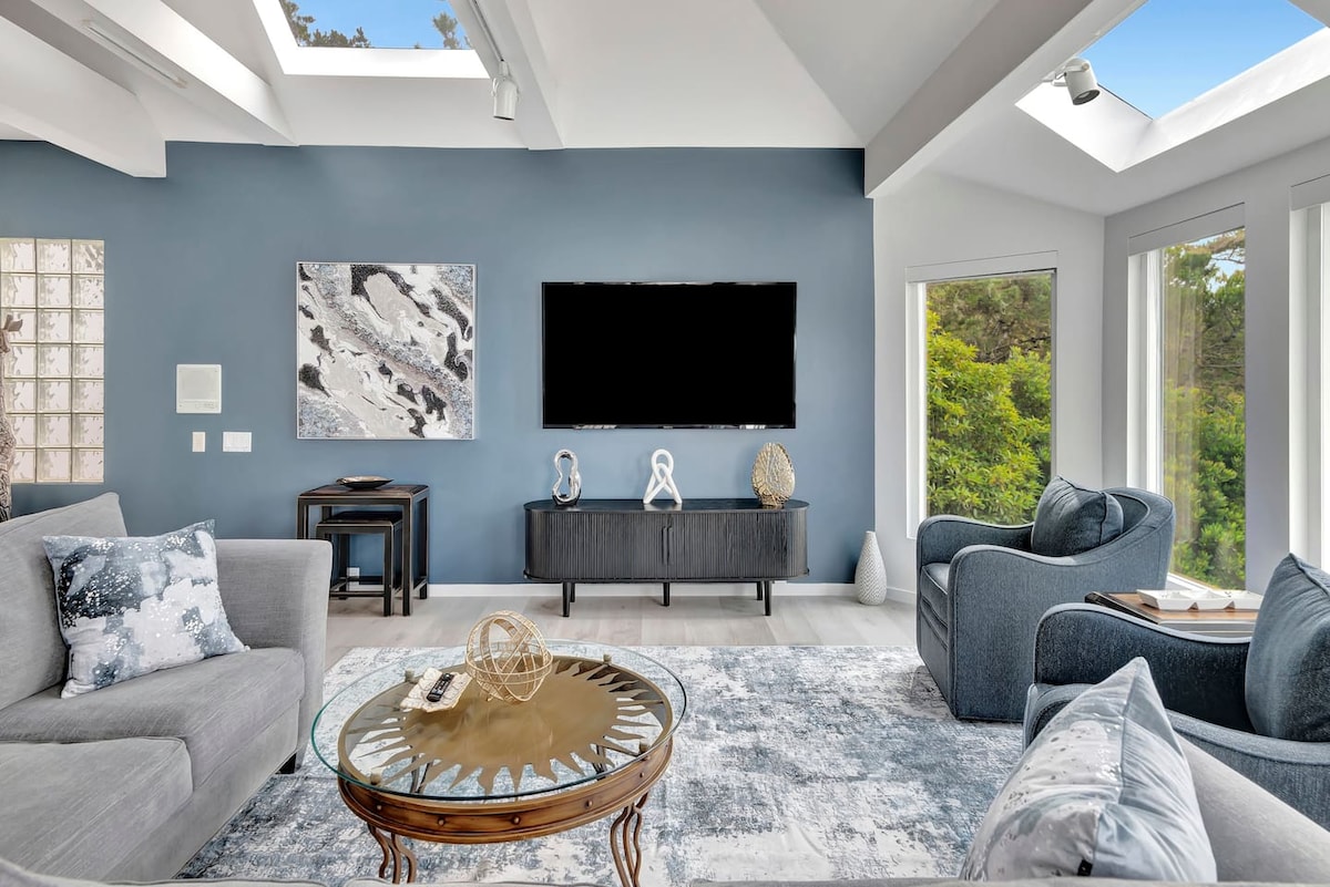 Kystbrise og 10 minutters kørsel til Hearst Castle.| Flygt fra stress og jag i dette fredelige, lysfyldte fristed. Med massive skydedøre i glas, der udvisker grænsen mellem den hyggelige stue og Stillehavet, inviterer vores hjem naturen indenfor. Efter en dag med at udforske Hearst Castle (kun 10 minutter væk!) eller gå en tur på Moonstone Beach-promenaden, kan du komme hjem og synke ned i blødt sengetøj og se solnedgangen fra din private terrasse med havudsigt.