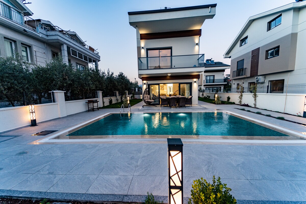 Luksusvilla med spektakulær havudsigt, pool , stor have og jacuzzi! En uforglemmelig ferieoplevelse i den smukkeste del af Fethiye venter på dig. Den er designet, så bryllupsrejsepar og familier kan bo der. Det er inden for gåafstand til stranden,restauranter , caféer og supermarkeder til stranden. Tredje sal er terrassen, hvor der er jacuzzi ,liggestol og spiseplads. Indgangene har trapper udefra. Der er en køkkenstue og et soveværelse på hver etage, og alle værelser har aircondition.